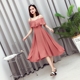 2017新款韩版气质女一字领露肩压褶收腰显瘦吊带连衣裙A字大摆裙