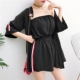 17新款韩版气质一字领露肩荷叶边套头上衣+高腰撞色边阔腿裤套装