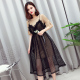 17夏装新款韩版时尚女圆领喇叭袖中长款T恤镂空网格吊带裙两件套