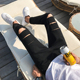 立夏潮流膝盖大破洞牛仔裤九分裤男韩版嘻哈宽松乞丐裤休闲哈伦裤