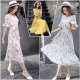 中长款显瘦修身碎花连衣裙圆领松紧腰套头短袖女2017年夏季