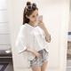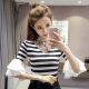 夏装新款韩版宽松短袖条纹衬衫女网纱拼接韩范衬衣荷叶边露肩上衣