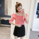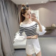 夏装新款韩版学生条纹短袖T恤女喇叭袖针织打底衫一字领露肩上衣