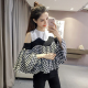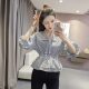 春季新款韩版时尚宽松长袖短款格子雪纺衫女喇叭袖荷叶边露肩上衣