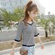 春夏冰丝V领中袖条纹针织衫女短款套头修身显瘦荷叶边喇叭袖上衣