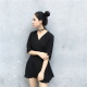 2017夏款新款 韩版纯色雪纺V领荷叶袖收腰气质连衣裙打底小黑裙
