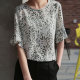 快乐家 2017夏新款舒适透气圆领荷叶袖印树叶真丝双绉衬衫 女上衣