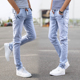 夏季抽绳牛仔裤男士韩版修身小脚磨白铅笔裤青少年潮流弹力裤子男
