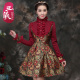玉羲宫廷复古连衣裙女长袖2017春装新款大红色印花拼接气质淑女裙