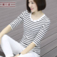 2017春装五分袖中袖黑白条纹t恤体恤七分袖v领打底衫大码女装上衣