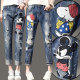 2017春季新款破洞米奇卡通宽松印花休闲大码九分牛仔裤女学院翻边