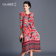 雨奇2017新款真丝连衣裙宽松大码印花蚕丝连衣裙中长款复古连衣裙