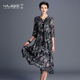 雨奇新款真丝V领连衣裙中长款蚕丝连衣裙宽松大码印花连衣裙长裙