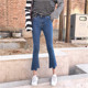 水洗高腰牛仔裤女基础款弹力修身显瘦九分微喇叭裤不规则割边裤子