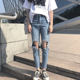 LEMON 个性膝盖破洞九分小脚裤女式乞丐裤学生潮高腰牛仔裤哈伦裤