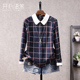 2017春装新款娃娃领套头长袖格子衬衫女大码修身磨毛衬衣打底上衣
