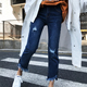 韩版2017春款中低腰蓝色裤脚开叉流苏显瘦弹力牛仔百搭9分裤女