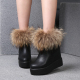 秋冬真皮鞋厚底内增高短靴女鞋坡跟高跟短筒靴狐狸毛雪地靴女靴子
