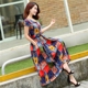 2017夏季新款波西米亚长款沙滩裙修身显瘦露肩短袖棉绸碎花连衣裙