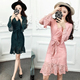 2016冬装韩版时尚性感V领喇叭袖系带拼接修身加绒蕾丝连衣裙女潮