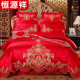 恒源祥家纺刺绣婚庆四件套大红结婚床品套件六床上用品1.8m