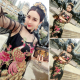 新款2017欧美名媛风复古图腾印花露腰性感露背开叉挂脖连衣裙