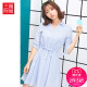三福2017夏装新品女翻领中袖连衣裙韩版系带收腰衬衫裙女潮368864