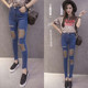 破洞牛仔裤女春夏季2017新款渔网高腰九分小脚铅笔韩版显瘦裤子潮