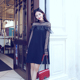 秋冬名媛气质黑色蕾丝拼接连衣裙长袖镂空性感礼服中长款女欧洲站