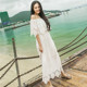 2017夏季海边旅游度假沙滩裙V领高腰长裙显瘦白色镂空蕾丝连衣裙