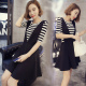 2016春夏新款甜美收腰显瘦深v领背心条纹短裙两件套装 背带连衣裙