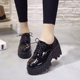 欧洲站2017春季新款漆皮女鞋百搭英伦粗跟高跟厚底防水台系带单鞋