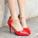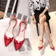 夏季性感中空凉鞋细跟尖头超高跟女鞋红色新娘鞋漆皮一字扣结婚鞋