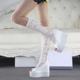 夏天凉鞋鱼嘴长靴白色女靴子夏2017性感蕾丝松糕厚底坡跟镂空网靴
