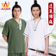 山人运动太极服夏款棉麻短袖男士拼接无领练功服亚麻太极拳服装