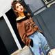 新款韩版拼色一字肩潮漏肩上衣 字母印花打底衫套头宽松长袖t恤女