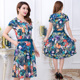 夏季新款女装裙子韩版修身大摆中长款短袖印花中老年连衣裙妈妈装