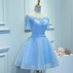 2017新款一字肩小礼服连衣裙女 天蓝色白色优雅气质短款晚装短袖