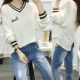 韩版秋冬学生上衣长袖T恤女V领宽松针织衫后背排扣开叉下摆打底衫
