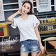 韩版女装夏新款宽松圆领t恤女镂空荷叶袖短袖纯棉纯色打底衫上衣