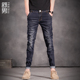 2017春夏款青年韩版男装猫爪破洞弹力修身牛仔裤男士显瘦小脚裤潮