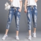 松紧腰七分裤休闲牛仔裤女夏破洞弹力显瘦大码胖mm短裤小脚裤薄
