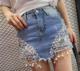 欧洲让2017夏季新款时尚百搭重工亮片串珠破洞显瘦热裤牛仔短裤女