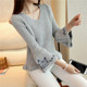 秋冬装修身荷叶边收腰下摆套头针织打底衫女喇叭袖刺绣毛衣外套