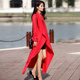 威娅纪针织连衣裙春装2017新款女开叉喇叭袖显瘦修身拖地长裙