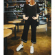 汐悠姿胖mm春夏新款2017大码女装V领针织上衣+阔腿裤两件套装6161