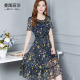 大码女装收腰印花连衣裙中年妇女中裙显瘦网纱裙碎花连衣裙 修身