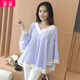胖mm大码韩版V领大喇叭袖衬衫宽松甜美少女娃娃衫长袖上衣女春秋