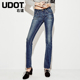 Udot右道新品四面弹不规则毛边裁剪黑色牛仔喇叭九分裤女秋UU9056