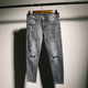 夏季潮流破洞修身九分牛仔裤男士鸟店东大门弹力休闲小脚乞丐裤男